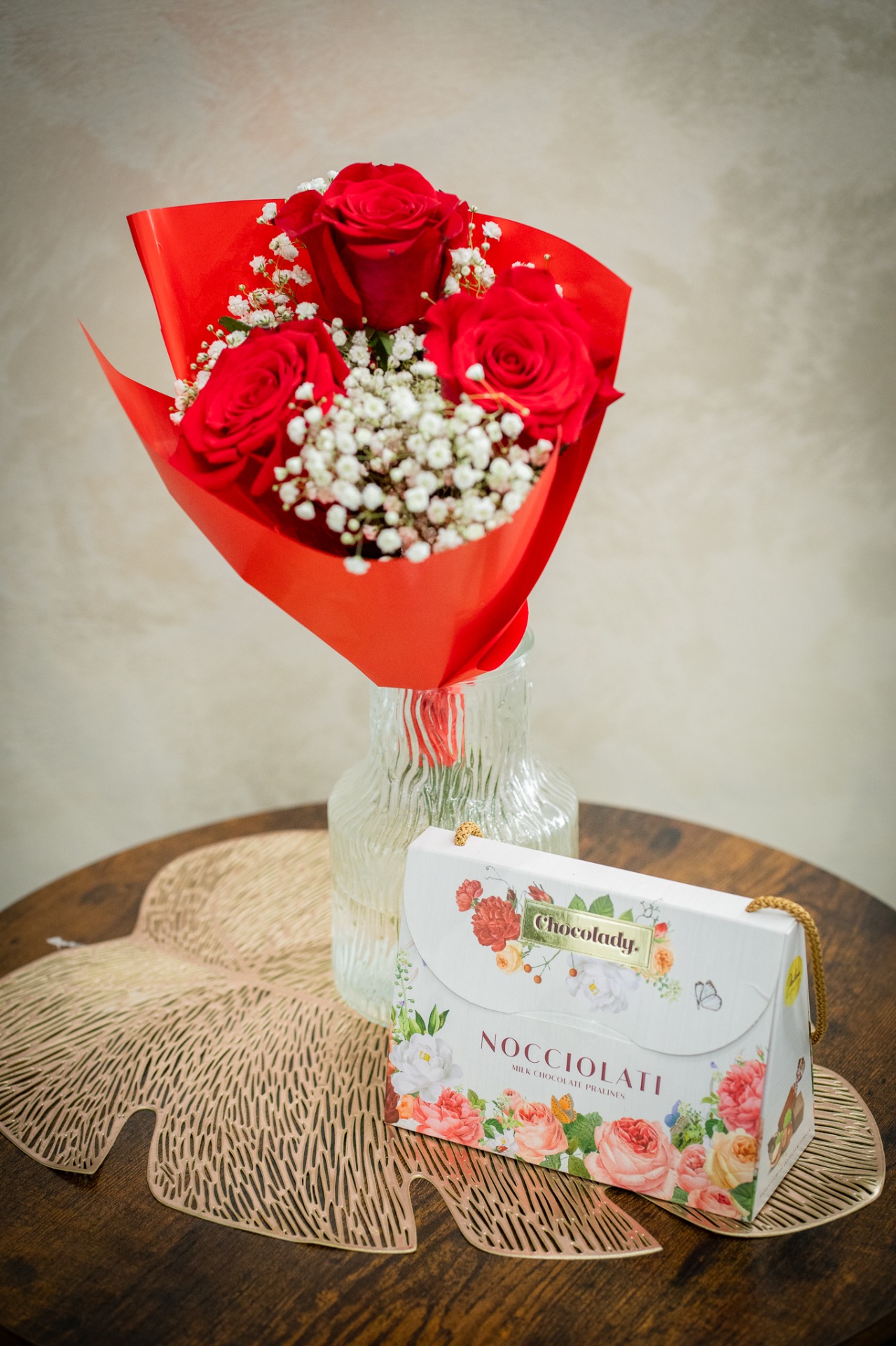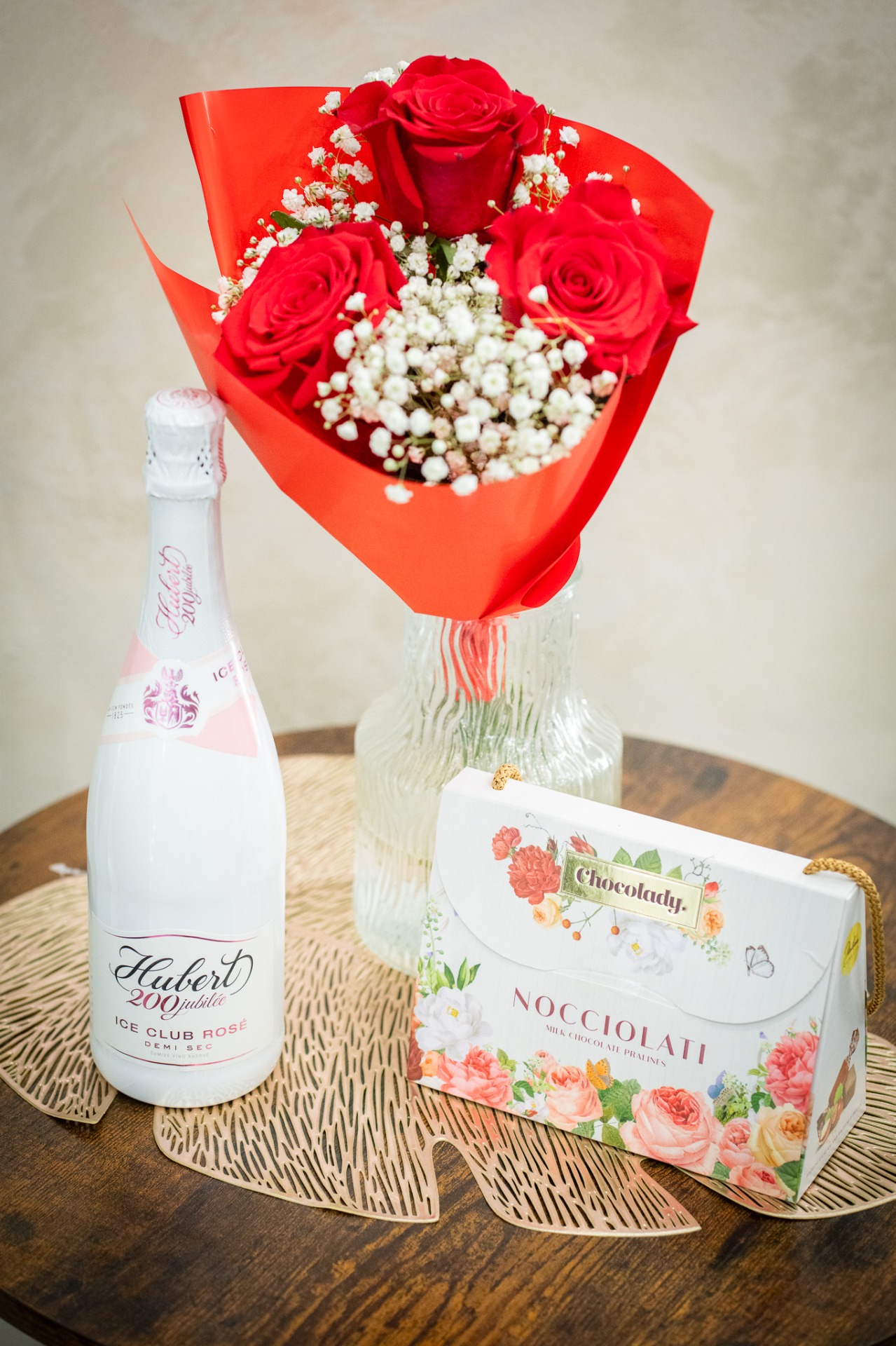 Romantický set "Romantika" obsahuje kyticu z 3 ruží a gypse, šampanské Hubert ICE  a dezert kabelku Chocolady NOCCIOLATI