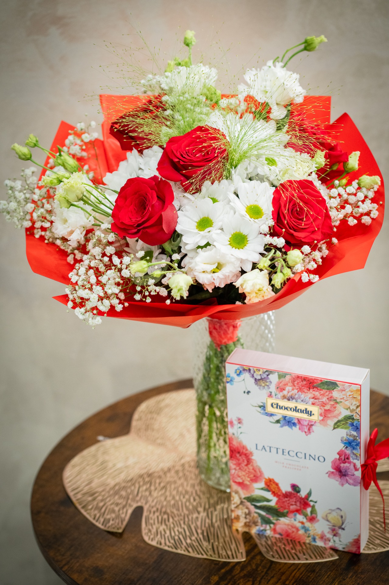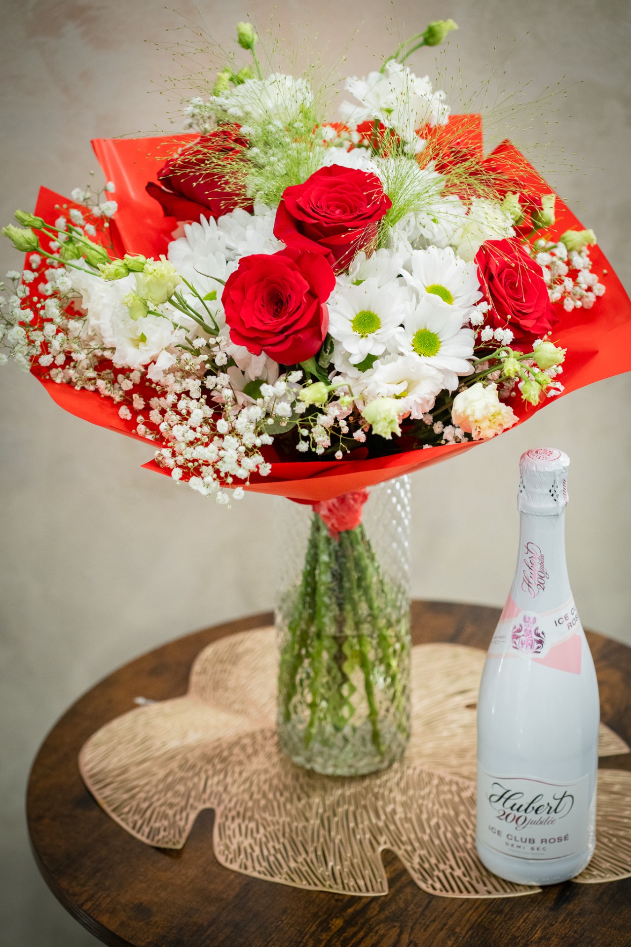 Romantický Set "Vášeň" obsahuje kyticu s ružami, šampanské Hubert De Luxe Rosé a dezert kniha Chocolady Latteccino