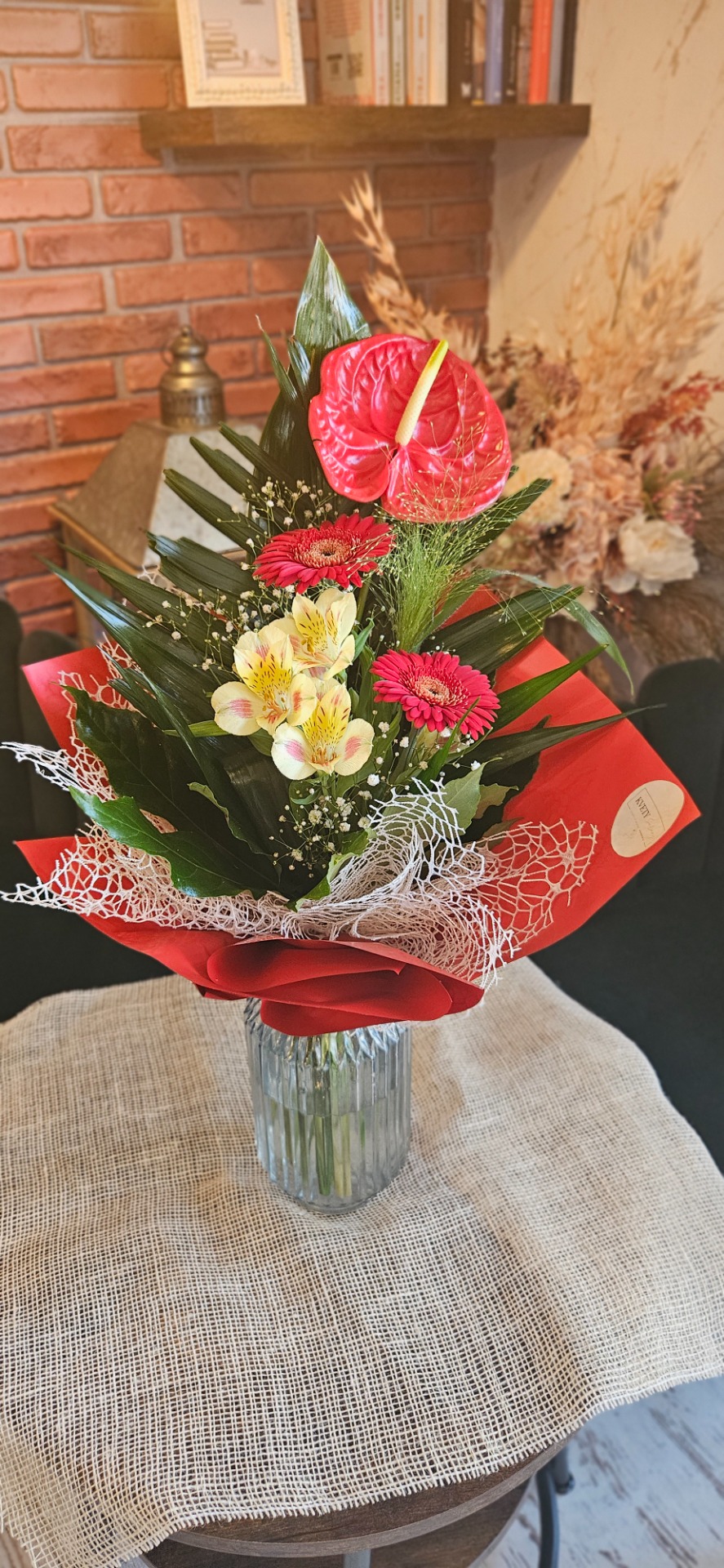 Kytica obsahuje červenú antúriu, dve červené germíny, žlté alstromérie, panicum, ozdobnú zeleň a dekoračný papier.