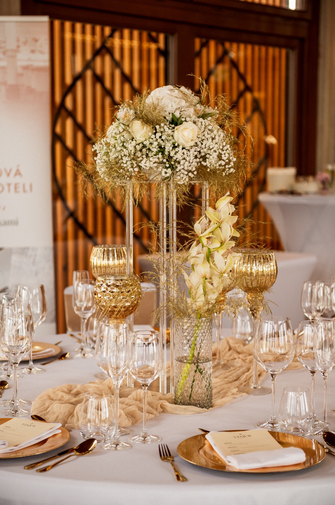 Naše aranžmány spájajú noblesu bielych kvetov, jemných detailov a zlatých doplnkov. Vytvárame harmonické kompozície, ktoré dodajú vašej svadbe či podujatiu exkluzívny nádych a nezameniteľný štýl.